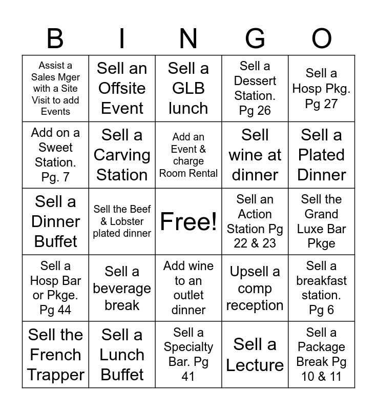 This bingo card has a free space and 24 words: Sell a beverage break, Sell a Lunch Buffet, Add an Event & charge Room Rental, Sell the French Trapper, Sell a Hosp Pkg. Pg 27, Assist a Sales Mger with a Site Visit to add Events, Add on a Sweet Station. Pg. 7, Sell an Offsite Event, Sell an Action Station Pg 22 & 23, Add wine to an outlet dinner, Sell wine at dinner, Sell a Dinner Buffet, Upsell a comp reception, Sell a breakfast station. Pg 6, Sell a Carving Station, Sell a Lecture, Sell the Grand Luxe Bar Pkge, Sell a GLB lunch, Sell a Plated Dinner, Sell the Beef & Lobster plated dinner, Sell a Package Break Pg 10 & 11, Sell a Hosp Bar or Pkge. Pg 44, Sell a Dessert Station. Pg 26 and Sell a Specialty Bar. Pg 41.