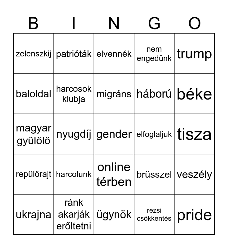 This bingo card has 25 words: harcolunk, ügynök, migráns, ukrajna, trump, zelenszkij, baloldal, patrióták, elfoglaljuk, online térben, háború, magyar gyűlölő, brüsszel, veszély, harcosok klubja, pride, tisza, elvennék, béke, nyugdíj, gender, ránk akarják erőltetni, repülőrajt, nem engedünk and rezsi csökkentés.