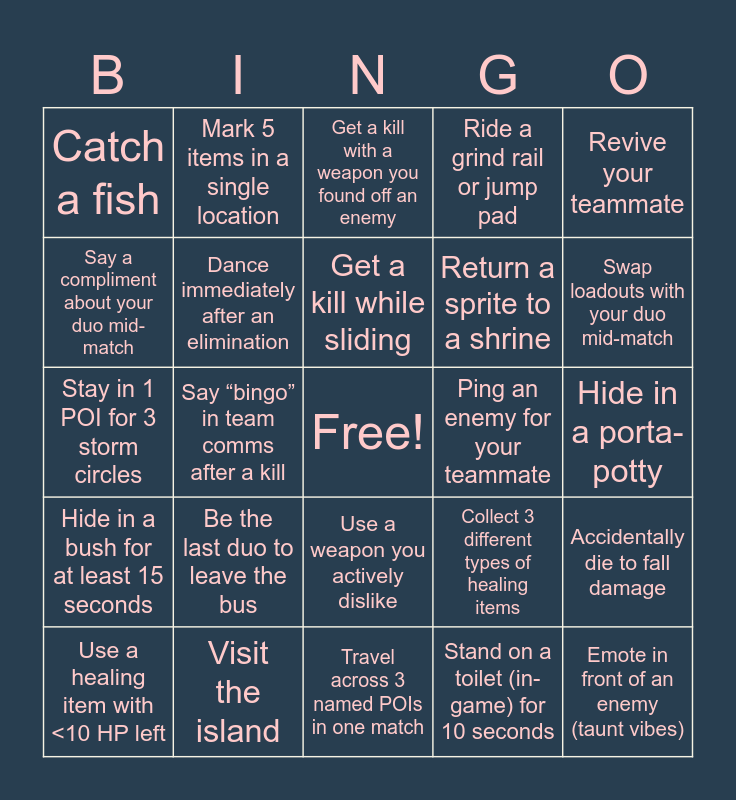 This bingo card has a free space and 36 words: Land at a POI that starts with the same letter as your duo name, Get an elim with a pistol, Use a medkit in a moving vehicle, Dance immediately after an elimination, Collect 3 different types of healing items, Hide in a bush for at least 15 seconds, Get a kill while sliding, Get knocked but survive the match, Revive your teammate, Finish a player with a pickaxe, Say “bingo” in team comms after a kill, Ride a grind rail or jump pad, Use 3 different mobility items in one match, Ping an enemy for your teammate, Swap loadouts with your duo mid-match, Catch a fish, Loot 3 different chests at the same POI, Be the last duo to leave the bus, Emote in front of an enemy (taunt vibes), Get a kill with a weapon you found off an enemy, Hide in a porta-potty, Accidentally die to fall damage, Visit the island, Use a healing item with <10 HP left, Travel across 3 named POIs in one match, Mark 5 items in a single location, Stay in 1 POI for 3 storm circles, Knock/Elim with a car, Return a sprite to a shrine, Say a compliment about your duo mid-match, Take a selfie (screenshot) in a funny hiding spot, Pick up an item your duo throws away, Stand on a toilet (in-game) for 10 seconds, Use a weapon you actively dislike, Dance on top of a car while it’s moving and Eliminate someone and yell “This one’s for the Hot Mess Express!”.