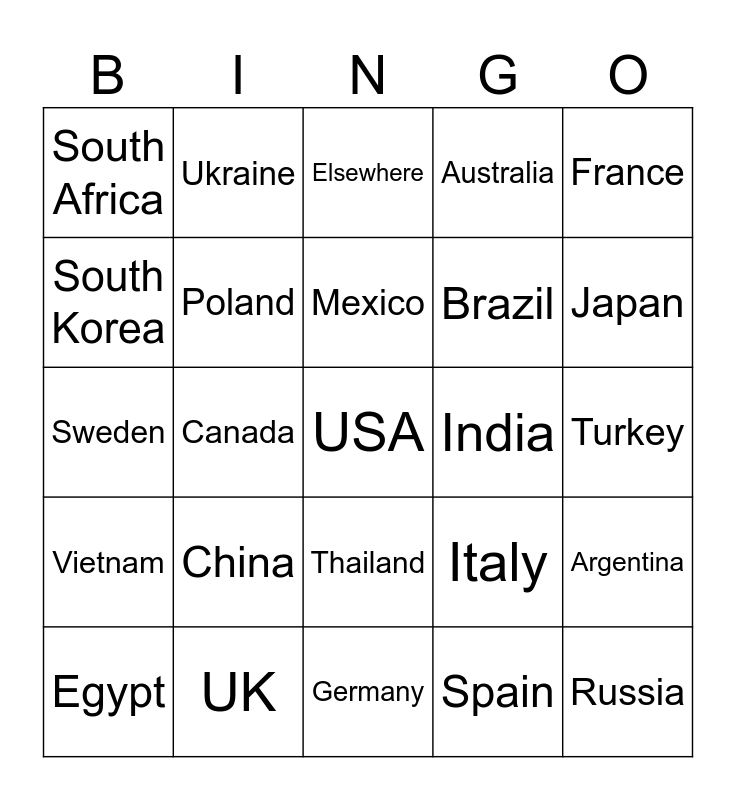 This bingo card has a free space and 24 words: China, UK, Mexico, Egypt, France, South Africa, South Korea, Ukraine, India, Thailand, Brazil, Sweden, Italy, Argentina, Poland, Spain, Turkey, Elsewhere, Japan, Canada, Russia, Vietnam, Australia and Germany.