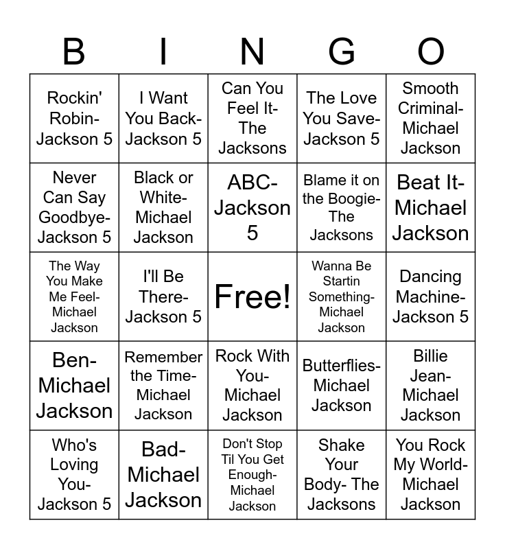 This bingo card has a free space and 24 words: Remember the Time- Michael Jackson, Bad- Michael Jackson, ABC- Jackson 5, Who's Loving You- Jackson 5, Smooth Criminal- Michael Jackson, Rockin' Robin- Jackson 5, Never Can Say Goodbye- Jackson 5, I Want You Back- Jackson 5, Wanna Be Startin Something- Michael Jackson, Rock With You- Michael Jackson, Blame it on the Boogie-The Jacksons, The Way You Make Me Feel- Michael Jackson, Butterflies- Michael Jackson, Billie Jean- Michael Jackson, Black or White- Michael Jackson, Shake Your Body- The Jacksons, Dancing Machine-Jackson 5, Can You Feel It- The Jacksons, Beat It- Michael Jackson, I'll Be There- Jackson 5, You Rock My World- Michael Jackson, Ben- Michael Jackson, The Love You Save- Jackson 5 and Don't Stop Til You Get Enough- Michael Jackson.