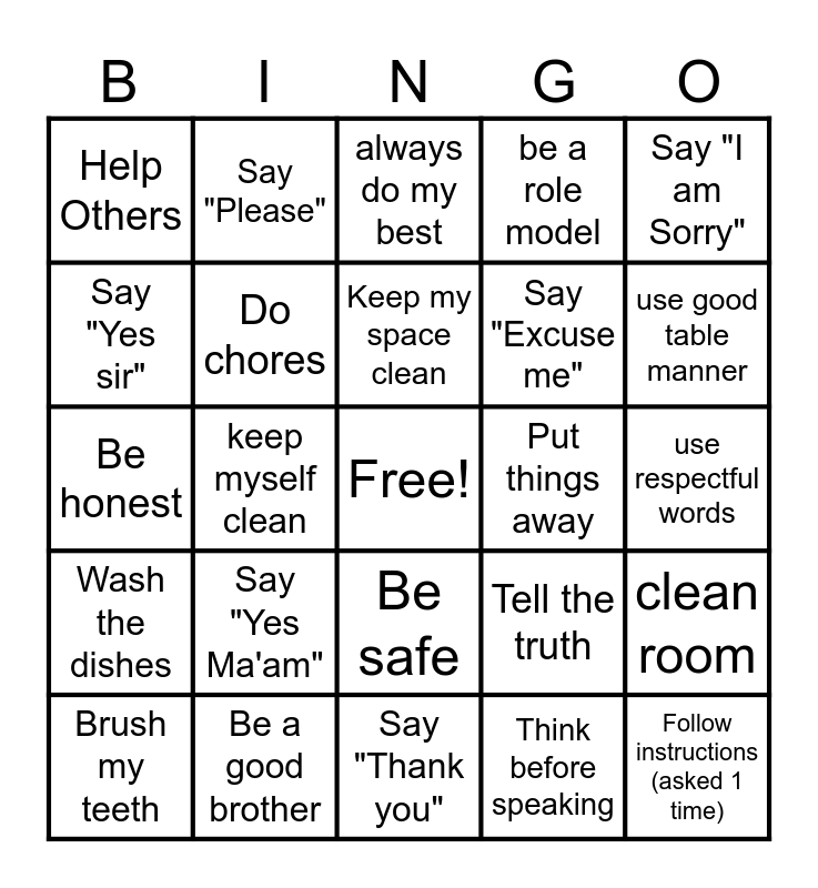 This bingo card has a free space and 24 words: Say "Yes Ma'am", Be a good brother, Keep my space clean, Brush my teeth, Say "I am Sorry", Help Others, Say "Yes sir", Say "Please", Put things away, Be safe, Say "Excuse me", Be honest, Tell the truth, clean room, Do chores, Think before speaking, use respectful words, always do my best, use good table manner, keep myself clean, Follow instructions (asked 1 time), Wash the dishes, be a role model and Say "Thank you".