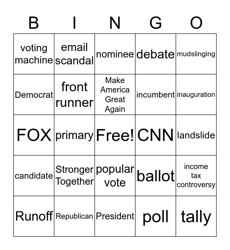 This bingo card has a free space and 24 words: Stronger Together, Republican, Make America Great Again, Runoff, mudslinging, voting machine, Democrat, email scandal, CNN, popular vote, incumbent, FOX, ballot, income tax controversy, front runner, poll, landslide, nominee, inauguration, primary, tally, candidate, debate and President.