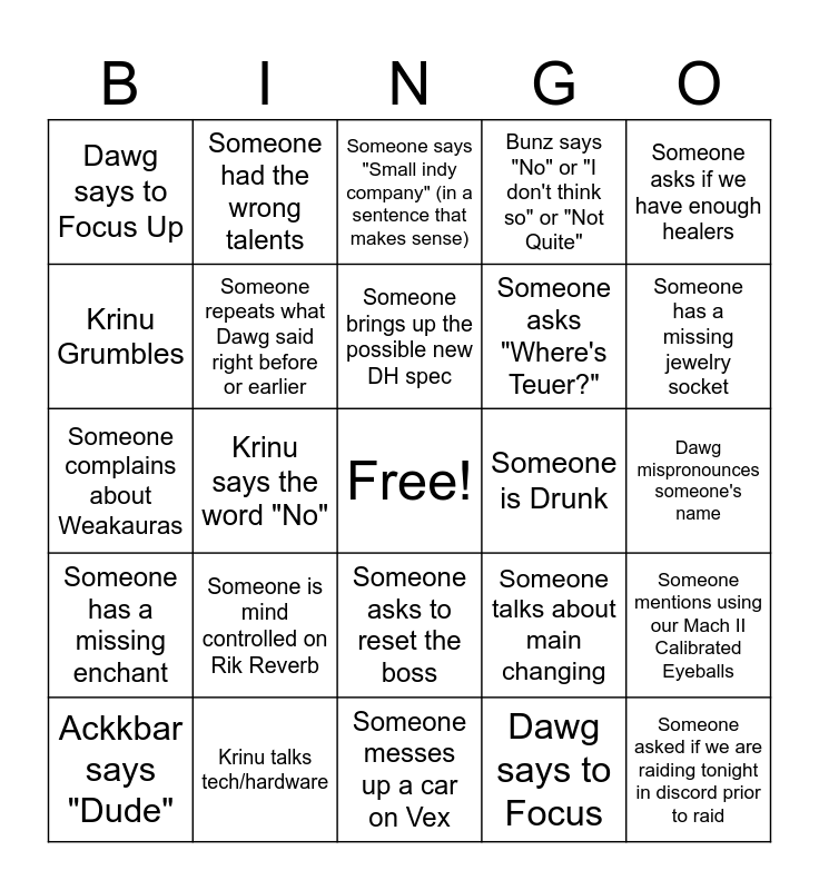 This bingo card has a free space and 28 words: Someone mentions using our Mach II Calibrated Eyeballs, Zyro Complains, Someone asks "Where's Teuer?", Dawg says to Focus, Krinu Grumbles, Someone says "Small indy company" (in a sentence that makes sense), Someone had the wrong talents, Someone has a missing enchant, Someone is Drunk, Ackkbar says "Dude", Someone complains about Weakauras, Bunz says "No" or "I don't think so" or "Not Quite", Krinu talks tech/hardware, Someone messes up a car on Vex, Someone has a missing jewelry socket, Umbra deafens himself in Discord, Someone is mind controlled on Rik Reverb, Someone repeats what Dawg said right before or earlier, Someone brings up the possible new DH spec, Someone asks to reset the boss, Dawg says to Focus Up, Fade insults Gut, Someone asked if we are raiding tonight in discord prior to raid, Krinu says the word "No", Dawg mispronounces someone's name, Someone talks about main changing, Someone asks if we have enough healers and Someone asks if we have too many healers.