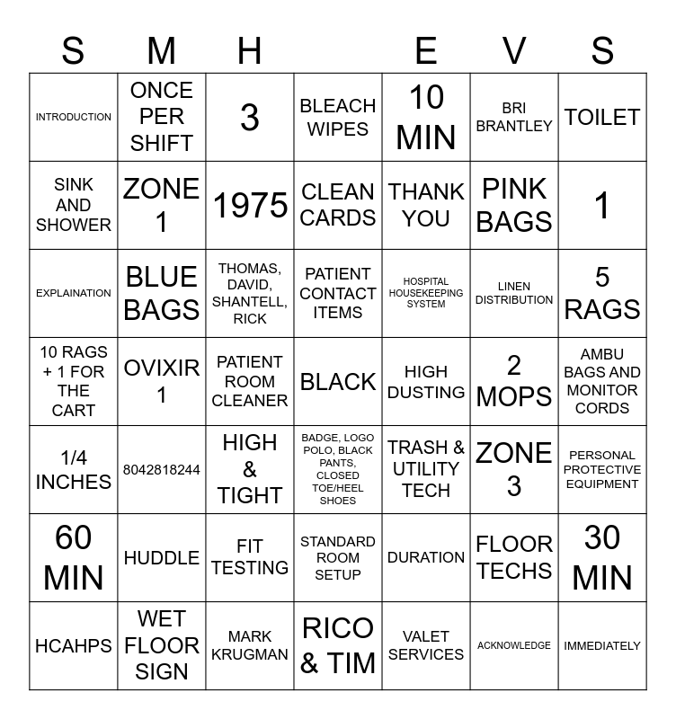 This bingo card has 56 words: ACKNOWLEDGE, 5 RAGS, BEDWATCH, INTRODUCTION, OVIXIR 1, FIT TESTING, TOILET, POWER UNITS, ZONE 1, STANDARD ROOM SETUP, BLEACH WIPES, 60 MIN, 1/4 INCHES, AMBU BAGS AND MONITOR CORDS, WET FLOOR SIGN, 8042818244, 10 MIN, THANK YOU, IMMEDIATELY, PINK BAGS, 1, HIGH & TIGHT, HOSPITAL HOUSEKEEPING SYSTEM, 3, Free!, SINK AND SHOWER, 2 MOPS, SOILED UTILITY ROOM, 1975, BADGE, LOGO POLO, BLACK PANTS, CLOSED TOE/HEEL SHOES, JAMARE DICKERSON, PERSONAL PROTECTIVE EQUIPMENT, HCAHPS, MARK KRUGMAN, EXPLAINATION, BRI BRANTLEY, CLEAN CARDS, HUDDLE, BLUE BAGS, ONCE PER SHIFT, PATIENT CONTACT ITEMS, BLACK, DURATION, GEL IN & GEL OUT, 30 MIN, THOMAS, DAVID, SHANTELL, RICK, 10 RAGS + 1 FOR THE CART, RICO & TIM, ZONE 3, HIGH DUSTING, PATIENT ROOM CLEANER, TRASH & UTILITY TECH, FLOOR TECHS, VALET SERVICES, LINEN DISTRIBUTION and PATIENT TRANSPORT.