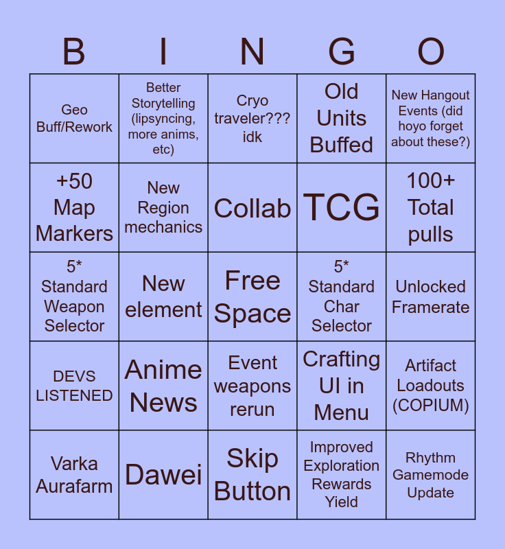 This bingo card has a free space and 24 words: Anime News, Dawei, Collab, Varka Aurafarm, New Hangout Events (did hoyo forget about these?), Geo Buff/Rework, +50 Map Markers, Better Storytelling (lipsyncing, more anims, etc), 5* Standard Char Selector, Event weapons rerun, TCG, 5* Standard Weapon Selector, Crafting UI in Menu, Artifact Loadouts (COPIUM), New Region mechanics, Improved Exploration Rewards Yield, Unlocked Framerate, Cryo traveler??? idk, 100+ Total pulls, New element, Rhythm Gamemode Update, DEVS LISTENED, Old Units Buffed and Skip Button.