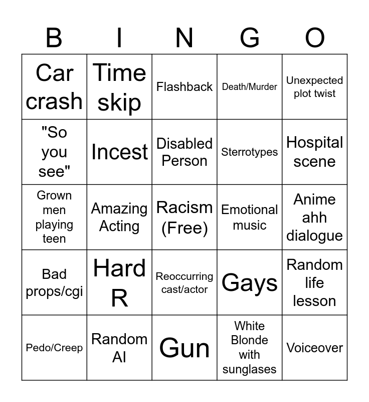 This bingo card has a free space and 24 words: Pedo/Creep, Hard R, Disabled Person, White Blonde with sunglases, Unexpected plot twist, Car crash, Time skip, Flashback, Emotional music, Anime ahh dialogue, Grown men playing teen, Incest, Gays, Random life lesson, "So you see", Random AI, Gun, Death/Murder, Hospital scene, Bad props/cgi, Amazing Acting, Reoccurring cast/actor, Sterrotypes and Voiceover.