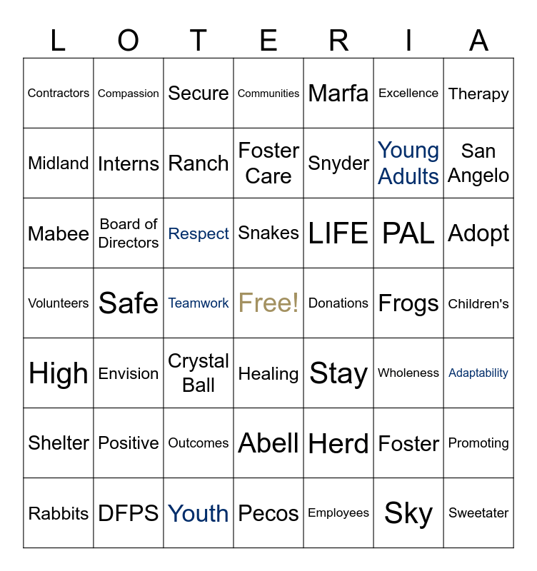 This bingo card has a free space and 53 words: Youth, Young Adults, Family, Teamwork, Respect, Adaptability, Compassion, Integrity, Excellence, Shelter, Therapy, Stay, PAL, LIFE, Foster, Adopt, Midland, San Angelo, Pecos, Marfa, Snyder, Sweetater, Interns, Contractors, Employees, Volunteers, High, Sky, Children's, Ranch, Dedicated, Healing, Herd, Promoting, Wholeness, Envision, Communities, Safe, Secure, Positive, Outcomes, Abell, Mabee, Noel, Rabbits, Snakes, Frogs, Crystal Ball, Foster Care, Board of Directors, DFPS, Donations and Programs.