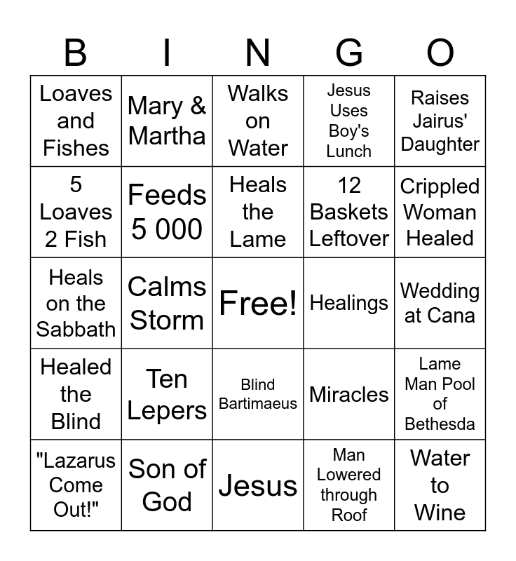 This bingo card has a free space and 31 words: Jesus, Miracles, Calms Storm, "Peace Be Still", Loaves and Fishes, Walks on Water, Feeds 5 000, Miracles, Healings, Man Lowered through Roof, Wedding at Cana, Water to Wine, Centurion's Servant Healed, Royal Official's Son Healed, Crippled Woman Healed, Shriveled Hand Healed, Lame Man Pool of Bethesda, Ten Lepers, Healed the Blind, Blind Bartimaeus, Raises Jairus' Daughter, Raises Lazarus, "Lazarus Come Out!", Mary & Martha, 12 Baskets Leftover, 5 Loaves 2 Fish, Jesus Uses Boy's Lunch, Heals on the Sabbath, Son of God, Heals the Lame and Heals the Sick.