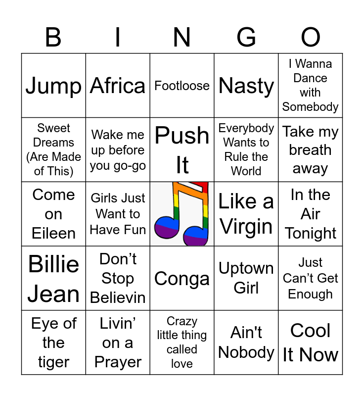 This bingo card has a free space and 33 words: Faith, Take on me, Girls Just Want to Have Fun, Sweet child o' mine, Billie Jean, Wake me up before you go-go, I Wanna Dance with Somebody, Eye of the tiger, Africa, Another One Bites the Dust, Push It, Footloose, When Doves Cry, Hungry like the wolf, Like a Virgin, Take my breath away, Livin’ on a Prayer, Come on Eileen, Don’t Stop Believin, Uptown Girl, Conga, Tainted Love, Jump, In the Air Tonight, Crazy little thing called love, Cool It Now, Nasty, Everybody Wants to Rule the World, Sweet Dreams (Are Made of This), Just Can’t Get Enough, It's Tricky, Ain't Nobody and Every breath you take.
