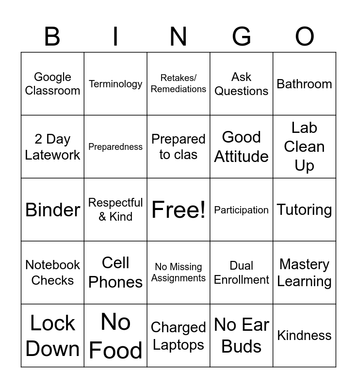 This bingo card has a free space and 24 words: Cell Phones, No Food, Prepared to clas, Lock Down, Bathroom, Google Classroom, 2 Day Latework, Terminology, Participation, No Missing Assignments, Good Attitude, Binder, Dual Enrollment, Mastery Learning, Preparedness, No Ear Buds, Tutoring, Retakes/ Remediations, Lab Clean Up, Respectful & Kind, Kindness, Notebook Checks, Ask Questions and Charged Laptops.