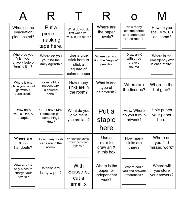 This bingo card has 43 words: Where will you store your artwork? ___________, Where is one place you cannot go without permission? ______________, What are we doing everyday? ______________, What do you give me if you are late? ___________, Use a ruler to draw an X in this box, Hole punch your paper here., What do you do first when you walk in the room? ______________, Which closet is the kiln in? __________, How many electric pencil sharpeners are in the room? _____________, Put a staple here, Where are the paper towels? __________, draw a blue balloon with a colored pencil, Where is the hot glue? __________, Where are the tissues? __________, With Scissors, cut a small x, How/ Where do you turn in artwork? ___________, Where do you find missed work? __________, Draw an X with a red crayola marker, Glue something here., Where can you find the "regular" pencils? _____________, Put a piece of masking tape here., Where is the only place to charge your device? _____________, How many sinks are there? ___________, Where is the evacuation plan posted? ___________, Put a piece of clear tape here, How many sinks are in the room? __________, How many trash cans are in the room? _____________, Shade with a pencil, then make an X with an eraser _____________, Draw an X with a THICK sharpie, What is one type of paintbrush? ___________, What do I do if I'm bleeding/ need a bandaid? _____________, Can I have Mrs. Thompson print something? How? ____________, Where are baby wipes? ___________, Where is the emergency exit in case of fire? ___________, Where are project references and rubrics? ______________, Where is the paper for independent work? ___________, Where are class handouts? ___________, Where do you you find the daily agenda? ____________, How do you spell Mrs. B's last name? ___________, Use a glue stick here to stick a square of colored paper, Where could you find artwork references? _____________, Where do you finish your artwork before turning it in? _____________ and Draw an X with a THIN sharpie.