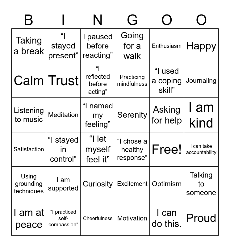 This bingo card has 36 words: Excitement, Curiosity, Motivation, Calm, Satisfaction, Serenity, Trust, Cheerfulness, Enthusiasm, Optimism, Journaling, Going for a walk, Talking to someone, Meditation, Practicing mindfulness, Taking a break, Using grounding techniques, Asking for help, Listening to music, I paused before reacting”, “I named my feeling”, “I stayed in control”, “I chose a healthy response”, “I let myself feel it”, Free!, “I stayed present”, “I used a coping skill”, “I practiced self-compassion”, “I reflected before acting”, Happy, Proud, I am at peace, I can take accountability, I am kind, I am supported and I can do this..