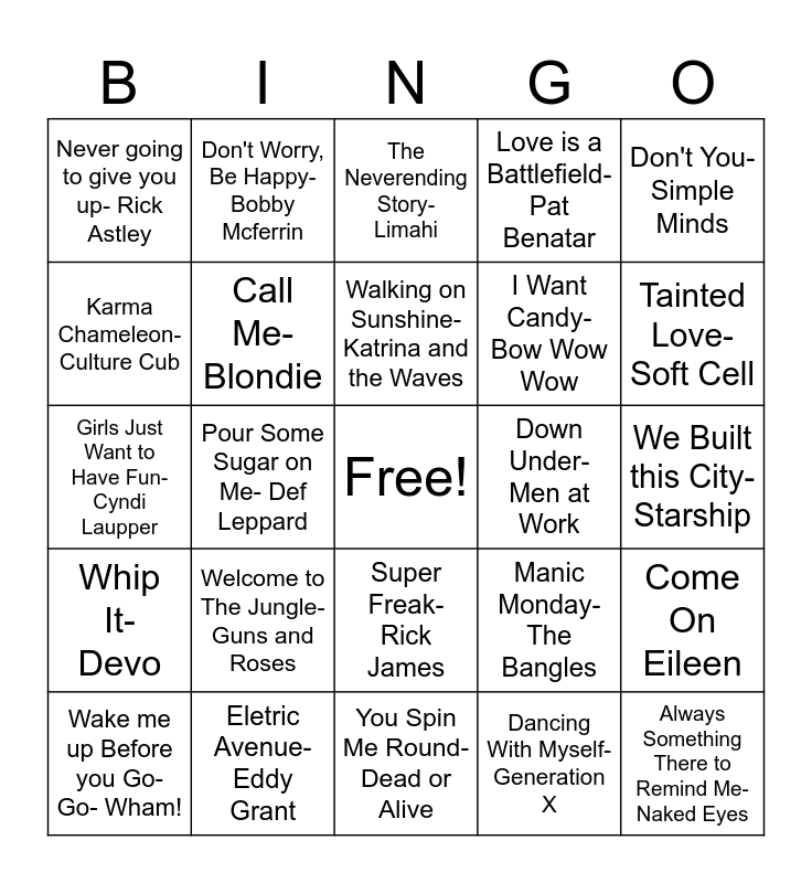 This bingo card has a free space and 35 words: Jesse's Girl- Rick Springfield, Dancing in the dark- Bruce Sprinsteen, Don't you Want me- The Human League, Call Me- Blondie, Super Freak- Rick James, Love is a Battlefield- Pat Benatar, Karma Chameleon- Culture Cub, Sunglasses at Night- Corey Hart, Walking on Sunshine- Katrina and the Waves, Footloose- Kenny Loggins, Girls Just Want to Have Fun- Cyndi Laupper, Don't You- Simple Minds, Free, Ghostbusters- Ray Parker Jr., Never going to give you up- Rick Astley, Down Under- Men at Work, Dancing With Myself- Generation X, Pour Some Sugar on Me- Def Leppard, Whip It- Devo, Always Something There to Remind Me- Naked Eyes, Manic Monday- The Bangles, Wake me up Before you Go-Go- Wham!, Come On Eileen, Eletric Avenue- Eddy Grant, The Neverending Story- Limahi, Tainted Love- Soft Cell, Everybody Have Fun Tonight- Wang Chung, Walk Like an Egyptian- The Bangles, I Want Candy- Bow Wow Wow, We Built this City- Starship, Livin on a Prayer- Bon Jovi, You Spin Me Round- Dead or Alive, Welcome to The Jungle- Guns and Roses, Don't Worry, Be Happy- Bobby Mcferrin and Our House- Madness.