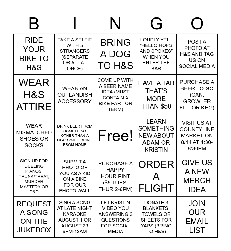 This bingo card has a free space and 75 words: SIT AT THE BAR, BRING A KID TO H&S, BRING A DOG TO H&S, SAY SOMETHING IN A FOREIGN LANGUAGE, GIVE A BEERTENDER A HIGH FIVE, LET A BEERTENDER CHOOSE YOUR BEER, BRING A RANDOM OBJECT FROM HOME THAT MAKES US LAUGH, TRY A MIX OF 2 BEERS, ORDER A BEER WITHOUT SPEAKING, TELL US YOUR BEST DAD JOKE, SING YOUR BEER ORDER, TOUCH THE HAUNTED TRIKE, COME UP WITH A BEER NAME IDEA (MUST CONTAIN A BIKE PART OR TERM), WEAR H&S ATTIRE, PET STOUT, DRINK BEER FROM SOMETHING OTHER THAN A GLASS/MUG:BRING FROM HOME, SHARE OUR ANNIVERSARY FLYER TO YOUR SOCIAL MEDIA, JOIN OUR EMAIL LIST, FOLLOW US ON INSTAGRAM OR FACEBOOK, POST A PHOTO AT H&S AND TAG US ON SOCIAL MEDIA, COMMENT ON ONE OF OUR INSTAGRAM OR FACEBOOK POSTS, WEAR MISMATCHED SHOES OR SOCKS, WEAR AN OUTLANDISH ACCESSORY, TAKE A SELFIE WITH 5 STRANGERS (SEPARATE OR ALL AT ONCE), LOUDLY YELL “HELLO HOPS AND SPOKES” WHEN YOU ENTER THE BAR, DO A DANCE IN FRONT OF THE BAR, CHEERS A MUG CLUB MEMBER, DRINK A TOUR DE LITE OR A BLONDE, DRINK A SELTZER OR CIDER, DRINK A SOUR OR A STOUT, DRINK A IRISH RED OR A ROOT BEER, DRINK A PALE ALE OR A PORTER, DRINK AN IPA (ANY KIND), ORDER A FLIGHT, PURCHASE A BEER TO GO (CAN, GROWLER FILL OR KEG), HAVE A TAB THAT’S MORE THAN $50, COME WITH A PARTY OF AT LEAST 6 PEOPLE, VISIT US @ OAK GLEN MARKET - 10AM-3PM SATURDAYS + SOME SUNDAYS, VISIT US AT COUNTYLINE MARKET ON 8/14 AT 4:30-8:30PM, DONATE 3 BLANKETS, TOWELS OR SHEETS FOR YAPS (BRING TO H&S), DONATE 3 NON PERISHABLE FOODS FOR FAMILY ASSISTANCE: BRING TO H&S, DONATE 3 SCHOOL SUPPLIES FOR A LOCAL SCHOOL: BRING TO H&S, ENJOY LIVE MUSIC 7-10PM MOST FRI/SAT + 4-7PM MOST SUNDAYS, PLAY A BOARD GAME (BYO OR USE OURS OR DO GAME NIGHT 8/1), PLAY A GAME OF POOL, PLAY A GAME OF BEER PONG, REQUEST A SONG ON THE JUKEBOX, RIDE YOUR BIKE TO H&S, PATRONIZE A FOOD TRUCK, ATTEND A NEW BEER RELEASE PARTY: 8/9 AND 8/31 4PM, PLAY FREE MUSIC BINGO: COUNTRY 8/2 7PM; 80S/90S HIPHOP 8/23 7PM, PURCHASE A HAPPY HOUR PINT ($5 TUES-THUR 2-6PM), ATTEND FREE TRIVIA 6:30PM EVERY THURSDAY - ASK ABOUT THEMES, LEARN SOMETHING NEW ABOUT ONE OF OUR NEW BEERTENDERS, BUY A BEER FOR A FRIEND OR FIRST RESPONDER ON SHARE THE BEER WALL, FOLLOW RIDGELINE BIKE SERVICE ON SOCIAL MEDIA, WEAR AN ORANGE SHIRT, REVIEW US ON YELP OR GOOGLE (5 STARS PLEASE HAHA), SIGN OUR 5 YEAR ANNIVERSARY KEG, WEAR YOUR SHIRT BACKWARDS, SUBMIT A PHOTO OF YOU AS A KID ON A BIKE FOR OUR PHOTO WALL, DANCE WITH A STRANGER, SUBMIT A PHOTO OF YOU WEARING HOPS AND SPOKES GEAR SOMEWHERE ELSE, COME WITH A COWORKER – PLEASE PROVIDE SOME SORT OF PROOF, COME WITH A SIBLING OR PARENT/CHILD – PROVIDE SOME SORT OF PROOF, LEARN SOMETHING NEW ABOUT ADAM OR KRISTIN, GIVE US A NEW EVENT IDEA, GET A FRIEND TO BUY A 5TH ANNIVERSARY CHALLENGE CARD, FOLLOW ONE OF OUR FOOD VENDORS ON SOCIAL MEDIA, GIVE US A NEW MERCH IDEA, SIGN UP FOR DUELING PIANOS, TRUNK/TREAT, MURDER MYSTERY OR D&D, SING A SONG AT LATE NIGHT KARAOKE AUGUST 1 OR AUGUST 23 9PM-12AM, LET A STRANGER CHOOSE YOUR BEER, LET KRISTIN VIDEO YOU ANSWERING 3 QUESTIONS FOR SOCIAL MEDIA and LET KRISTIN VIDEO YOU TOASTING YOUR FRIENDS FOR SOCIAL MEDIA.