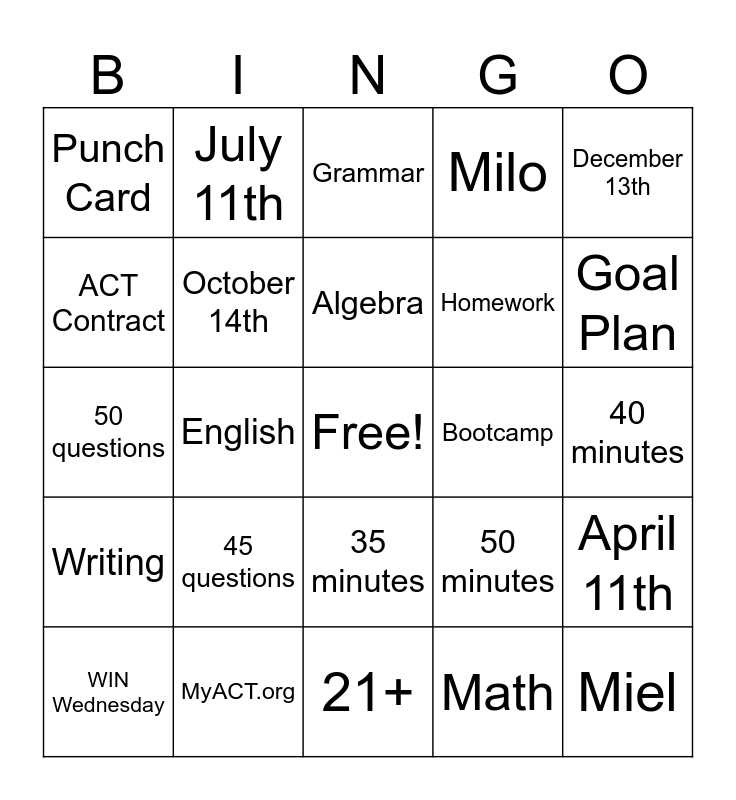 This bingo card has a free space and 32 words: Math, Reading, English, Science, Writing, October 14th, December 13th, April 11th, July 11th, MasteryPrep, Algebra, Grammar, Geometry, Sentence Structure, Bootcamp, October 8th, WIN Wednesday, 50 questions, 35 minutes, 45 questions, 50 minutes, 36 questions, 40 minutes, MyACT.org, Miel, Milo, Homework, ACT Contract, Punch Card, 21+, Disco and Goal Plan.