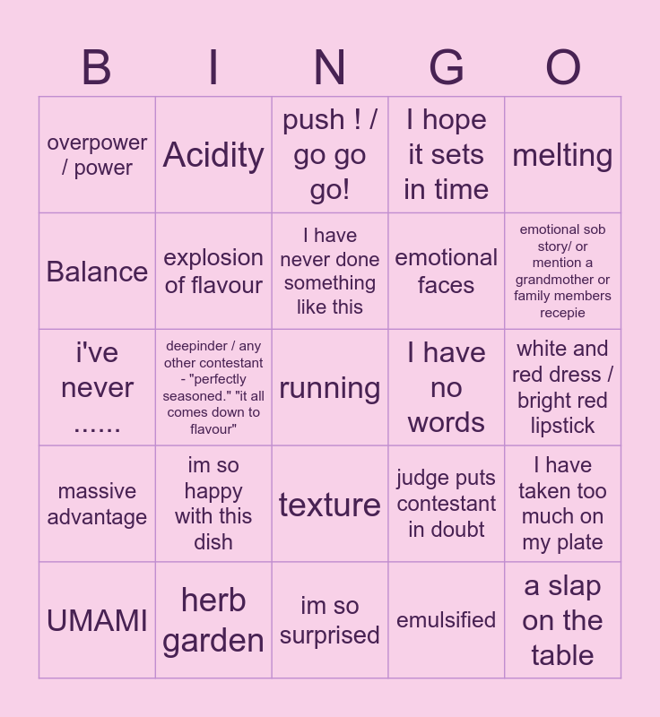 This bingo card has 25 words: im so happy with this dish, im so surprised, I have never done something like this, UMAMI, melting, overpower / power, Balance, Acidity, I have no words, texture, emotional faces, i've never ......, judge puts contestant in doubt, I have taken too much on my plate, explosion of flavour, a slap on the table, white and red dress / bright red lipstick, push ! / go go go!, emotional sob story/ or mention a grandmother or family members recepie, deepinder / any other contestant - "perfectly seasoned." "it all comes down to flavour", running, herb garden, massive advantage, I hope it sets in time and emulsified.