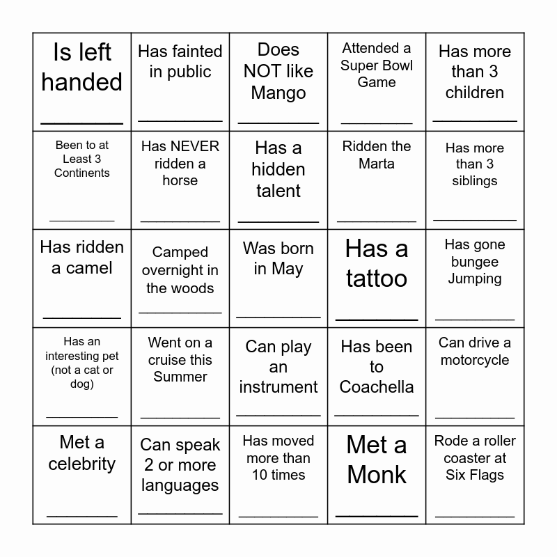 This bingo card has 25 words: Went on a cruise this Summer __________, Has moved more than 10 times __________, Has a hidden talent ________, Met a celebrity _______, Has more than 3 children _________, Is left handed ______, Been to at Least 3 Continents __________, Has fainted in public _________, Has a tattoo ______, Can play an instrument _________, Ridden the Marta __________, Has ridden a camel ________, Has been to Coachella _________, Can drive a motorcycle __________, Has NEVER ridden a horse __________, Rode a roller coaster at Six Flags __________, Has gone bungee Jumping __________, Does NOT like Mango ________, Has more than 3 siblings ___________, Camped overnight in the woods __________, Was born in May _________, Can speak 2 or more languages _________, Has an interesting pet (not a cat or dog) ___________, Attended a Super Bowl Game _________ and Met a Monk ______.