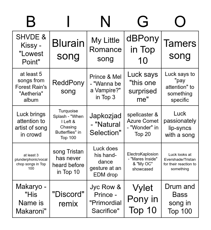 This bingo card has 25 words: song Tristan has never heard before in Top 10, Jyc Row & Prince - "Primordial Sacrifice", Prince & Mel - "Wanna be a Vampire?" in Top 3, Makaryo - "His Name is Makaroni", Tamers song, SHVDE & Kissy - "Lowest Point", at least 5 songs from Forest Rain's "Aetheria" album, Blurain song, spellcaster & Azure Comet - "Wonder" in Top 20, Luck does his hand-dance gesture at an EDM drop, Luck says "this one surprised me", Luck brings attention to artist of song in crowd, ElectroKaplosion - "Mares Inside" & "My OC" showcased, Luck looks at Evershade/Tristan for their reaction to something, ReddPony song, Drum and Bass song in Top 100, Luck passionately lip-syncs with a song, My Little Romance song, Luck says to "pay attention" to something specific, Turquoise Splash - "When I Left & Chasing Butterflies" in Top 100, Japkozjad - "Natural Selection", "Discord" remix, at least 3 plunderphonic/vocal chop songs in Top 100, dBPony in Top 10 and Vylet Pony in Top 10.