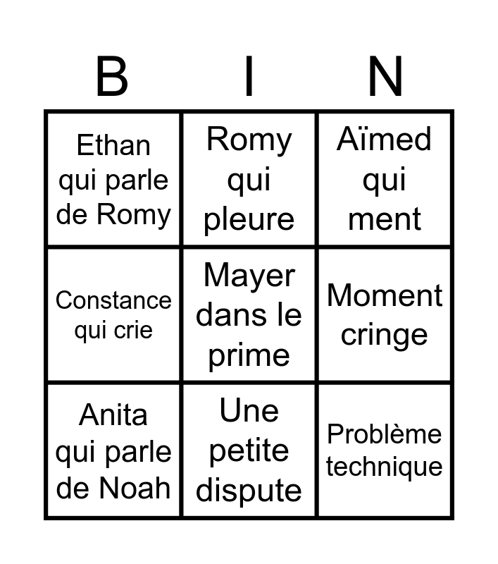 This bingo card has 9 words: Anita qui parle de Noah, Aïmed qui ment, Romy qui pleure, Constance qui crie, Ethan qui parle de Romy, Moment cringe, Mayer dans le prime, Problème technique and Une petite dispute.