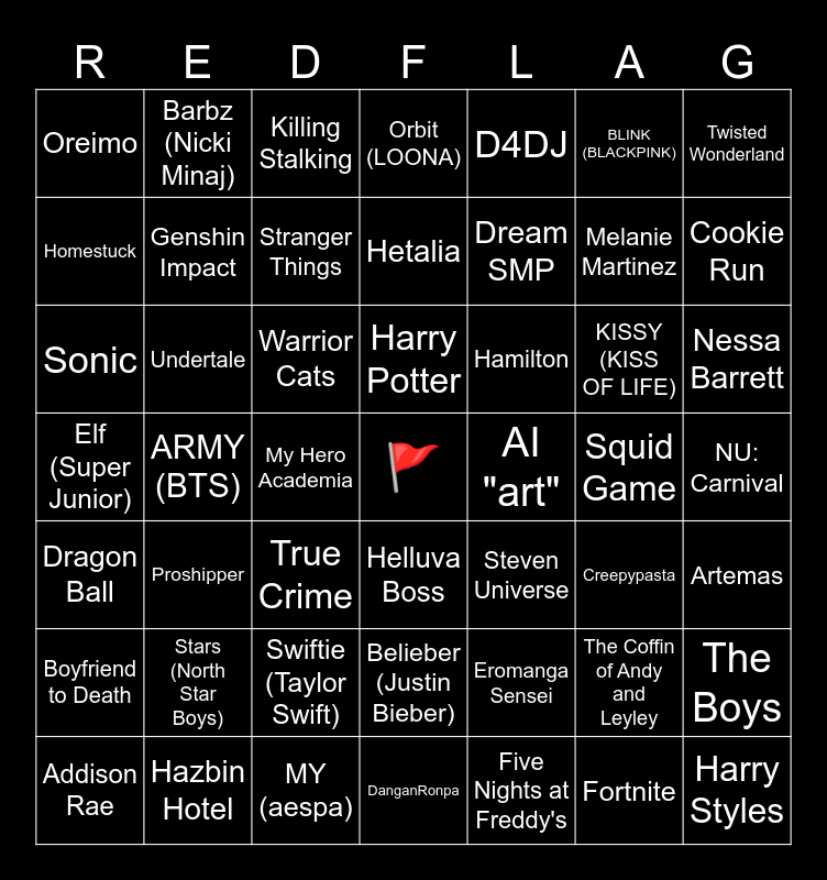 This bingo card has a free space and 48 words: Eromanga Sensei, Melanie Martinez, DanganRonpa, ARMY (BTS), Warrior Cats, NU: Carnival, Barbz (Nicki Minaj), Hazbin Hotel, BLINK (BLACKPINK), Helluva Boss, Twisted Wonderland, Orbit (LOONA), KISSY (KISS OF LIFE), Hamilton, Boyfriend to Death, Squid Game, Homestuck, Cookie Run, The Coffin of Andy and Leyley, D4DJ, Dream SMP, My Hero Academia, Oreimo, Genshin Impact, The Boys, Stranger Things, Nessa Barrett, Addison Rae, Harry Potter, Undertale, Fortnite, AI "art", Artemas, Stars (North Star Boys), Elf (Super Junior), Steven Universe, Creepypasta, Sonic, True Crime, Swiftie (Taylor Swift), Dragon Ball, Harry Styles, Killing Stalking, MY (aespa), Hetalia, Belieber (Justin Bieber), Proshipper and Five Nights at Freddy's.