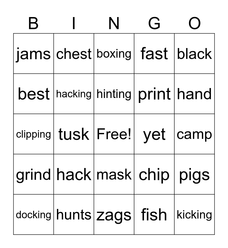 This bingo card has a free space and 24 words: hack, hunts, hinting, docking, black, jams, best, chest, yet, mask, print, clipping, chip, pigs, hacking, fish, camp, boxing, hand, tusk, kicking, grind, fast and zags.