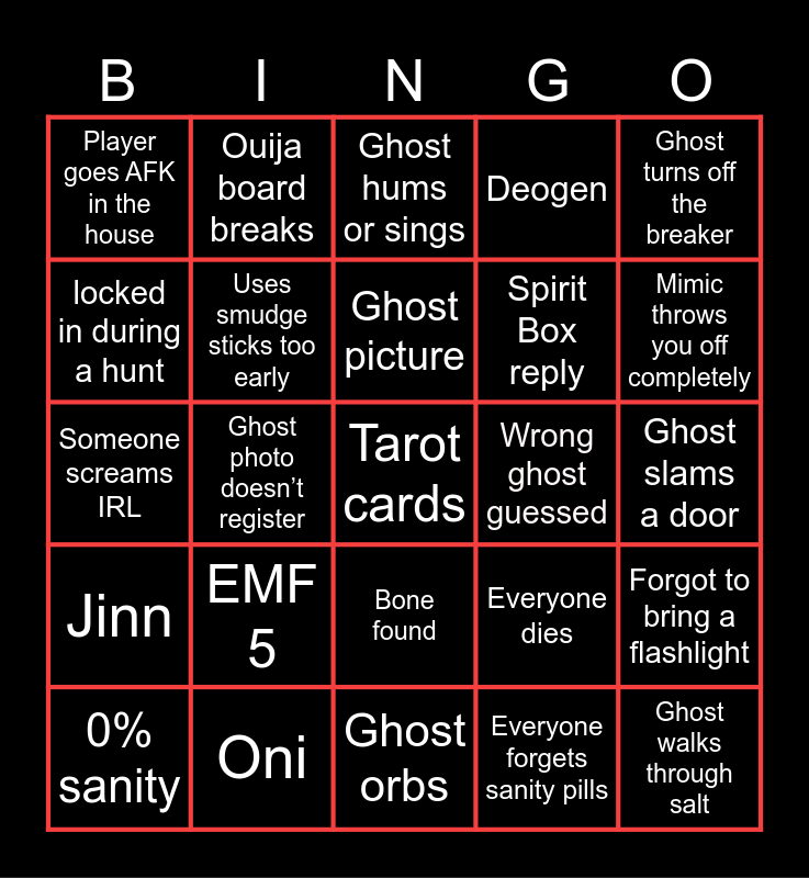 This bingo card has 25 words: EMF 5, Ghost orbs, Ghost picture, 0% sanity, Ghost turns off the breaker, Player goes AFK in the house, locked in during a hunt, Ouija board breaks, Wrong ghost guessed, Bone found, Spirit Box reply, Someone screams IRL, Everyone dies, Forgot to bring a flashlight, Uses smudge sticks too early, Ghost walks through salt, Ghost slams a door, Ghost hums or sings, Mimic throws you off completely, Ghost photo doesn’t register, Tarot cards, Oni, Jinn, Deogen and Everyone forgets sanity pills.
