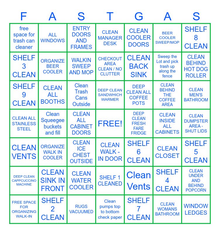 This bingo card has a free space and 48 words: Clean Vents, Sweep the Lot and pick trash up along the fence, Clean pumps top to bottom check paper, Clean Squeegee buckets and fill, Clean Trash Cans Outside, CLEAN DUMPSTER AREA - SHUT LIDS, ALL WINDOWS, SHELF 2 CLEAN, BEER COOLER SWEEP/MOP, CLEAN WALK - IN DOOR, SHELF 8 CLEAN, CLEAN MANAGER DESK, CLEAN BEHIND THE COFFEE AREA, DEEP CLEAN ALL COFFEE POTS, DEEP CLEAN CAPPCUCCINO MACHINE, CLEAN INSIDE ALL CABINETS, SHELF 3 CLEAN, CLEAN BEHIND HOT DOG ROLLER, SHELF 4 CLEAN, CLEAN COOLER DOORS, CLEAN BACK SINK, CLEAN ALL CABINET DOORS, free space for trash can cleaner, ORGANIZE BEER COOLER, CLEAN UNDER AND BEHIND POPCORN, WALKIN SWEEP AND MOP, CLEAN MEN'S BATHROOM, FREE SPACE FOR ORGANIZING WALK-IN, DEEP CLEAN SANDWHICH WARMER, CLEAN ALL BOOTHS, CLEAN WOMANS BATHROOM, DEEP CLEAN FRESH FARE FRIDGE, SHELF 5 CLEAN, CLEAN SINK IN FRONT, CLEAN ALL STAINLESS STEEL, SHELF 6 CLEAN, CLEAN CLOSET, SHELF 9 CLEAN, CLEAN ICE CHEST OUTSIDE, CLEAN WATER COOLER, CLEAN VENTS, WINDOW LEDGES, ENTRY DOORS AND FRAMES, RUGS VACUUMED, CHECKOUT AREA CLEAN / NO CLUTTER, SHELF 1 CLEANED, ORGANIZE WALK IN COOLER and SHELF 7 CLEAN.