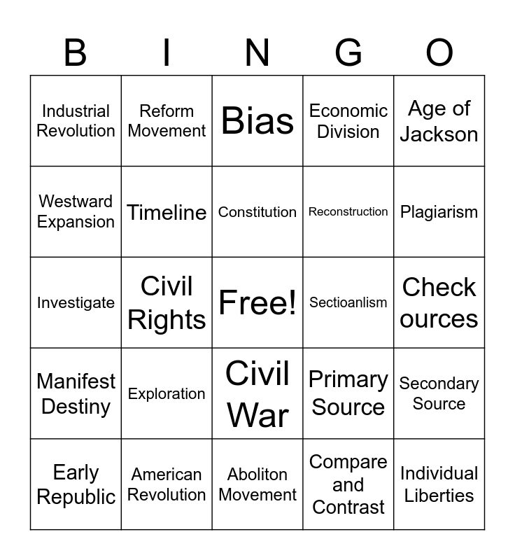 This bingo card has a free space and 24 words: Exploration, American Revolution, Constitution, Early Republic, Age of Jackson, Industrial Revolution, Westward Expansion, Reform Movement, Sectioanlism, Civil War, Reconstruction, Investigate, Primary Source, Secondary Source, Timeline, Compare and Contrast, Check ources, Bias, Plagiarism, Civil Rights, Individual Liberties, Manifest Destiny, Economic Division and Aboliton Movement.