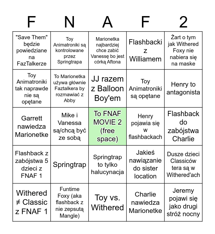 This bingo card has a free space and 24 words: Withered ≠ Classic z FNAF 1, Springtrap, JJ razem z Balloon Boy'em, Charlie nawiedza Marionetke, Żart o tym jak Withered Foxy nie nabiera się na maske, "Save Them" będzie powiedziane na FazTalkerze, Toy Animatroniki są kontrolowane przez Springtrapa, Marionetka najbardziej chce zabić Vanessę bo jest córką Aftona, Henry pojawia się w flashbackach, Flashback do zabójstwa Charlie, Garrett nawiedza Marionetke, To Marionetka używa głównie Faztalkera by rozmawiać z Abby, Jakieś nawiązanie do sister location, Dusze dzieci Classiców tera są w Withered'ach, Toy Animatroniki tak naprawde nie są opętane, Funtime Foxy (aka flashback z nie zepsutą Mangle), Toy vs. Withered, Flashbacki z Williamem, Henry to antagonista, Flashback z zabójstwa 5 dzieci z FNAF 1, Mike i Vanessa są/chcą być ze sobą, Springtrap to tylko halucynacja, Toy Animatroniki są opętane and Jeremy pojawi się jako drugi stróż nocny.