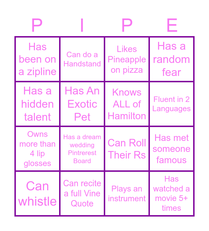 This bingo card has 24 words: Can Roll their Tongue, Can do a cartwheel, Fluent in 2 Languages, Has a favorite Coffee Order, Has a hidden talent, Has been on a zipline, Has An Exotic Pet, Can do a Handstand, Can recite a full Vine Quote, Can Do a Split, Owns more than 4 lip glosses, Can Roll Their Rs, Can touch tongue to their nose, Snapchats Daily, Knows ALL of Hamilton, Binge-watched an entire series in a weekend, Plays an instrument, Likes Pineapple on pizza, Has a dream wedding Pintrerest Board, Has met someone famous, Can whistle, Has watched a movie 5+ times, Has a random fear and Has a unique nickname.