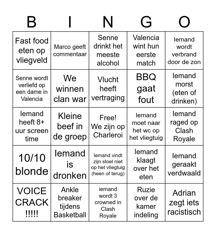 This bingo card has a free space and 49 words: Ryan zegt "deze guy", Adrian zegt iets racistisch, Ben yapt over Asian Baddies, iemand wordt 3 crowned in Clash Royale, Iemand is dronken, Jelle wordt geragebait, Marco geeft commentaar, Everton doet zesty/gay, Senne wordt verliefd op een dame in Valencia, We zien fine shyt, We winnen clan war, Valencia wint hun eerste match, Iemand geraakt verdwaald, Iemand klaagt over het eten, Het is tering warm, Iemand vindt zijn bagage niet op de band, Vlucht heeft vertraging, Iemand moet naar het wc op het vliegtuig, Tibo begint over FIFA of OHL te praten, Iemand wordt verbrand door de zon, Kleine beef in de groep, Ruzie over de kamer indeling, Fast food eten op vliegveld, BBQ gaat fout, Eten verbrand, Iemand morst (eten of drinken), VOICE CRACK !!!!!, STOTTER !!!!!!, Iemand vindt zijn stoel niet op het vliegtuig (heen of terug), 10/10 blonde, 10/10 brunette, KOELKAST !!!!!, Adrian en Ben discussie over iets doms, We zien iemand met botox, Ankle breaker tijdens Basketball, Iemand wordt gesmoked tijdens pool, Iemand verliest tering hard in Ping Pong, Jelle praat over HALO, Iemand raged op Clash Royale, Everton yapt over Latina Baddies, Marco gedraagd zich als unc, We gaan veel te laat slapen, Iemand slaapt tot na 10u, Adrian meeste uur op TikTok, Iemand heeft 8+ uur screen time, Senne drinkt het meeste alcohol, kkr dure taxi, Iemand geeft 60+ euro uit in Valencia (eten of boodschappen betalen telt niet) and Iemand gooned.