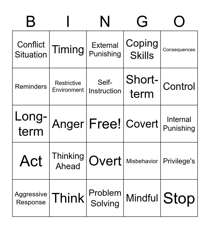 This bingo card has a free space and 25 words: Thinking Ahead, Problem Solving, Self-Instruction, Aggressive Response, Consequences, Conflict Situation, Reminders, Timing, Covert, Overt, Short-term, Long-term, Misbehavior, Privilege's, Restrictive Environment, Thinking Before Acting, Internal Punishing, External Punishing, Control, Anger, Stop, Think, Act, Coping Skills and Mindful.
