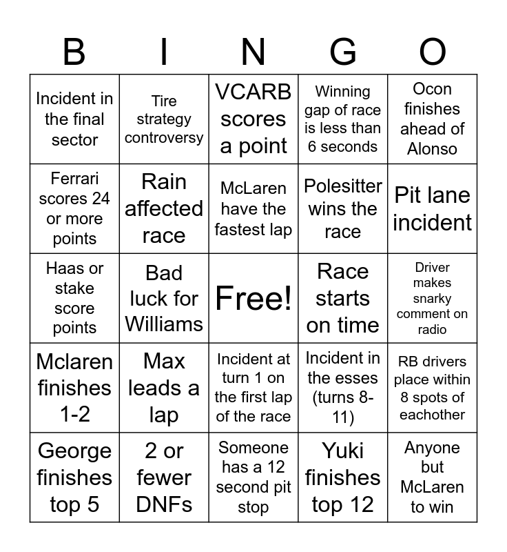 This bingo card has a free space and 24 words: George finishes top 5, Max leads a lap, McLaren have the fastest lap, Yuki finishes top 12, Ocon finishes ahead of Alonso, Incident in the final sector, Tire strategy controversy, VCARB scores a point, Race starts on time, Driver makes snarky comment on radio, Haas or stake score points, Rain affected race, Incident in the esses (turns 8-11), RB drivers place within 8 spots of eachother, Ferrari scores 24 or more points, 2 or fewer DNFs, Someone has a 12 second pit stop, Winning gap of race is less than 6 seconds, Pit lane incident, Mclaren finishes 1-2, Bad luck for Williams, Incident at turn 1 on the first lap of the race, Polesitter wins the race and Anyone but McLaren to win.