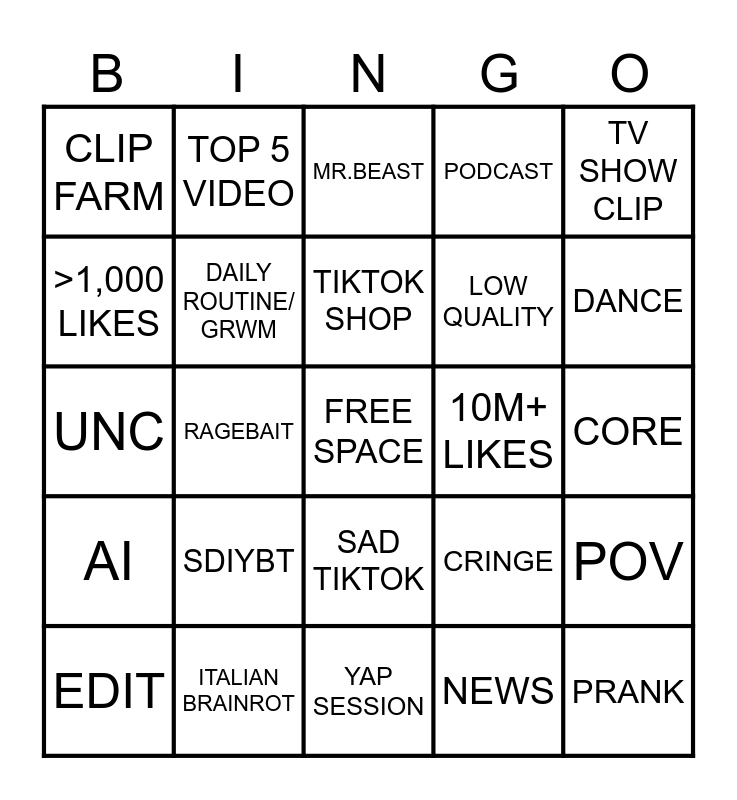 This bingo card has a free space and 24 words: EDIT, SDIYBT, TIKTOK SHOP, NEWS, TV SHOW CLIP, CLIP FARM, TOP 5 VIDEO, MR.BEAST, 10M+ LIKES, CORE, UNC, DAILY ROUTINE/ GRWM, CRINGE, POV, >1,000 LIKES, ITALIAN BRAINROT, YAP SESSION, PODCAST, DANCE, AI, RAGEBAIT, SAD TIKTOK, LOW QUALITY and PRANK.