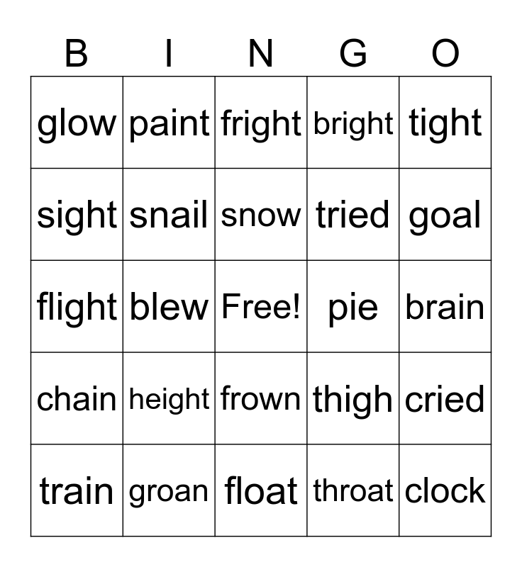 This bingo card has a free space and 24 words: train, height, snow, throat, tight, glow, paint, fright, pie, brain, flight, snail, thigh, cried, sight, groan, float, bright, goal, chain, blew, frown, tried and clock.