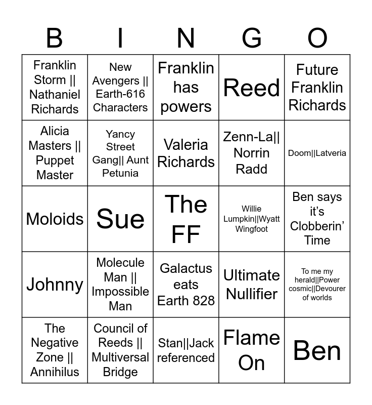 This bingo card has a free space and 24 words: Molecule Man || Impossible Man, Council of Reeds || Multiversal Bridge, Valeria Richards, The Negative Zone || Annihilus, Future Franklin Richards, Franklin Storm || Nathaniel Richards, Alicia Masters || Puppet Master, New Avengers || Earth-616 Characters, Willie Lumpkin||Wyatt Wingfoot, Galactus eats Earth 828, Zenn-La|| Norrin Radd, Moloids, Ultimate Nullifier, To me my herald||Power cosmic||Devourer of worlds, Yancy Street Gang|| Aunt Petunia, Flame On, Ben says it’s Clobberin’ Time, Franklin has powers, Doom||Latveria, Sue, Ben, Johnny, Reed and Stan||Jack referenced.