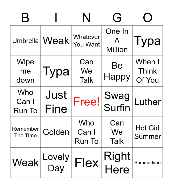 ⚠ This card has duplicate items: Truth or Dare (2), Summertime (2), So Amazing (2), Hot Girl Summer (2), Weak (2), Cuff It (2), Can We Talk (2), Who Can I Run To (3), Percolator (2), Luther (2), Typa (2), Swag Surfin (2), Wipe me down (2), Just Fine (2), Level Up (2)