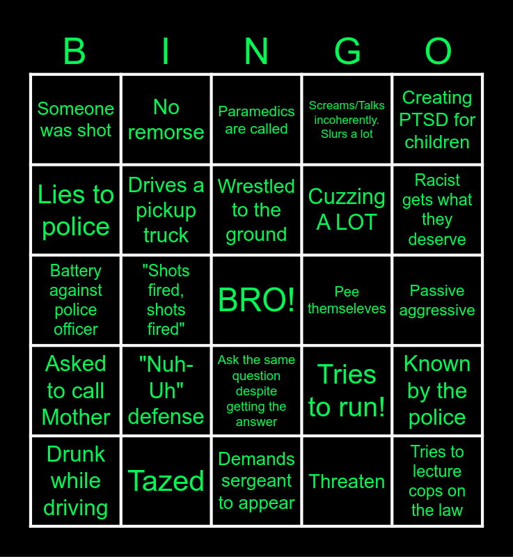This bingo card has a free space and 24 words: "Nuh-Uh" defense, Tazed, Wrestled to the ground, Drunk while driving, Creating PTSD for children, Someone was shot, Lies to police, No remorse, Pee themseleves, Ask the same question despite getting the answer, Cuzzing A LOT, Battery against police officer, Tries to run!, Known by the police, Drives a pickup truck, Threaten, Passive aggressive, Paramedics are called, Racist gets what they deserve, "Shots fired, shots fired", Tries to lecture cops on the law, Asked to call Mother, Screams/Talks incoherently. Slurs a lot and Demands sergeant to appear.