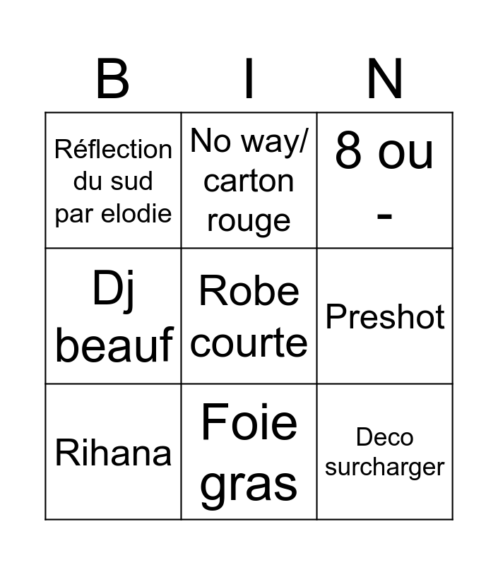 This bingo card has a free space and 8 words: Preshot, 8 ou -, No way/ carton rouge, Rihana, Réflection du sud par elodie, Deco surcharger, Dj beauf and Foie gras.