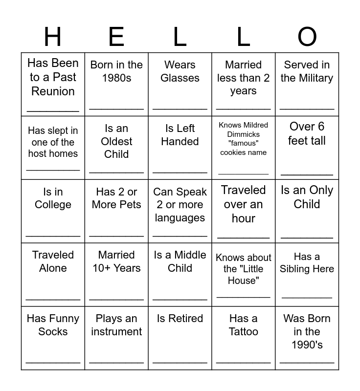This bingo card has 29 words: Has Funny Socks _________, Lives in Another State ________, Has 2 or More Pets _________, Was Born in the 1990's _________, Has Been to a Past Reunion ________, Wears Glasses _________, Is an Oldest Child _________, Married 10+ Years _________, Traveled over an hour ________, Plays an instrument _________, Is an Only Child ________, Can Speak 2 or more languages _________, Is Retired _________, Has a Tattoo _________, Over 6 feet tall ________, Owns Their Own Business __________, Is a Middle Child _________, Traveled Alone _________, Served in the Military _________, Is in College _________, Knows about the "Little House" __________, Flew to Get Here ________, Knows Mildred Dimmicks "famous" cookies name ____________, Has slept in one of the host homes __________, Married less than 2 years _________, Born in the 1980s _________, Has a Sibling Here _________, Is Left Handed _________ and Is a Great-Grandparent __________.