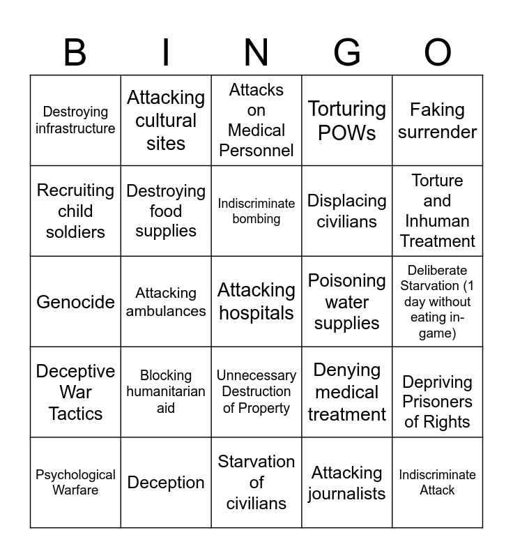 This bingo card has 50 words: Targeting civilians, Attacking hospitals, Human Shields, Starvation of civilians, Blocking humanitarian aid, Forced displacement, Attacking cultural sites, Collective punishment, Recruiting child soldiers, Arbitrary detention, Destroying food supplies, Torturing POWs, Depriving Prisoners of Rights, Denying medical treatment, Forcing POWs to fight, Using chemical weapons, Indiscriminate bombing, Poisoning water supplies, Using white phosphorus, Faking surrender, Attacking ambulances, Attacking journalists, Destroying infrastructure, Displacing civilians, Attacking UN peacekeepers, Indiscriminate Attack, Torture and Inhuman Treatment, Attacking cultural sites (churches), Attacks on Medical Personnel, Unnecessary Destruction of Property, Attacks on Refugees, Spreading False Information (to Provoke Attacks), Exploitation of Prisoners, Summary Executions, Deception, Use of Improper Military Targets, Biological Warfare (yellow and green m18), Excessive Use of Force, Targeting Cultural Sites, Deliberate Starvation (1 day without eating in-game), Mutilation of Bodies, Disproportionate Attacks, Fake Surrenders, Weapons That Cause Unnecessary Suffering (makes people cry), Psychological Warfare, Genocide, Abuse of War Correspondents, Disrespect for the Dead, Deceptive War Tactics and Failure to Provide Medical Aid.