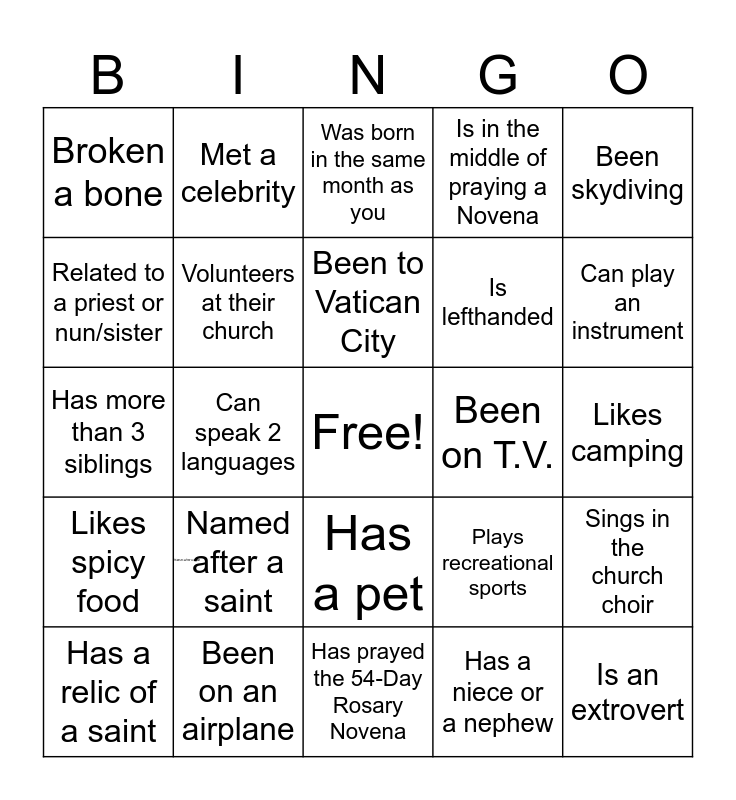 This bingo card has 1 images, a free space and 24 words: Named after a saint, Been on an airplane, Been to Vatican City, Has a relic of a saint, Been skydiving, Broken a bone, Related to a priest or nun/sister, Met a celebrity, Been on T.V., Has a pet, Is lefthanded, Has more than 3 siblings, Plays recreational sports, Sings in the church choir, Volunteers at their church, Has a niece or a nephew, Likes camping, Was born in the same month as you, Can play an instrument, Can speak 2 languages, Is an extrovert, Likes spicy food, Is in the middle of praying a Novena and Has prayed the 54-Day Rosary Novena.