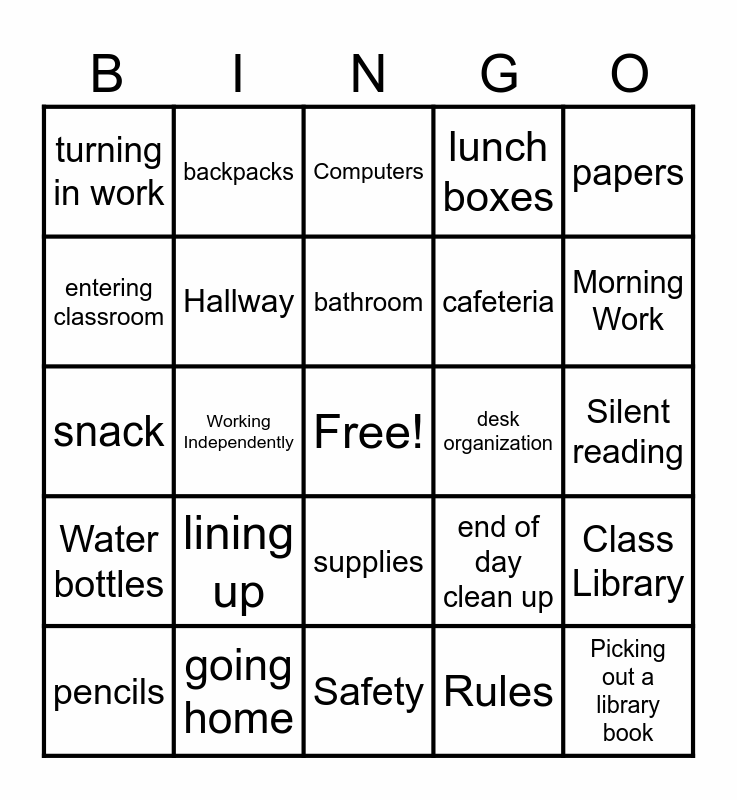 This bingo card has a free space and 24 words: lining up, going home, bathroom, pencils, papers, turning in work, entering classroom, backpacks, desk organization, supplies, cafeteria, snack, end of day clean up, Class Library, Hallway, Rules, Silent reading, Computers, Morning Work, Working Independently, Picking out a library book, Water bottles, lunch boxes and Safety.