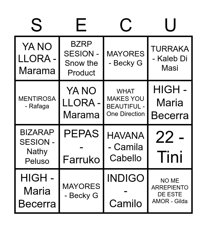 ⚠ This card has duplicate items: HAVANA - Camila Cabello (2), HIGH - Maria Becerra (2), YA NO LLORA - Marama (2), MAYORES - Becky G (2)