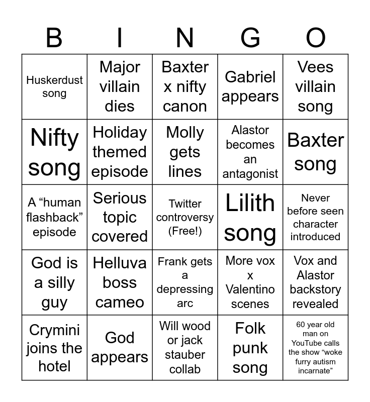 This bingo card has a free space and 24 words: Helluva boss cameo, God appears, Molly gets lines, Crymini joins the hotel, Vees villain song, Huskerdust song, Nifty song, Major villain dies, Lilith song, Frank gets a depressing arc, Alastor becomes an antagonist, A “human flashback” episode, More vox x Valentino scenes, Vox and Alastor backstory revealed, Holiday themed episode, Folk punk song, Never before seen character introduced, Baxter x nifty canon, Baxter song, Serious topic covered, 60 year old man on YouTube calls the show “woke furry autism incarnate”, God is a silly guy, Gabriel appears and Will wood or jack stauber collab.