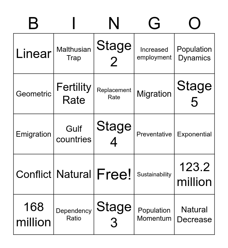 This bingo card has 26 words: Free!, Population Momentum, Replacement Rate, Dependency Ratio, Population Dynamics, Linear, Geometric, Malthusian Trap, Exponential, Sustainability, Migration, Emigration, 123.2 million, 168 million, Gulf countries, 4 million, Increased employment, Conflict, Stage 2, Stage 4, Stage 5, Stage 3, Preventative, Natural, Fertility Rate and Natural Decrease.