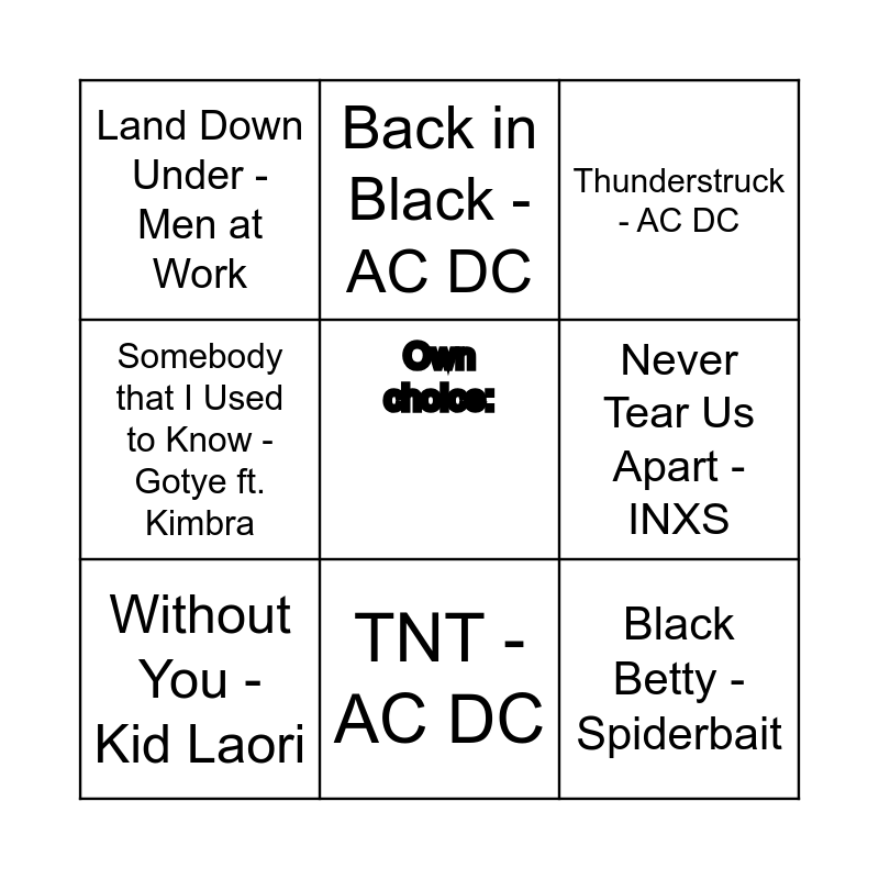 This bingo card has a free space and 10 words: TNT - AC DC, Thunderstruck - AC DC, Land Down Under - Men at Work, Black Betty - Spiderbait, Somebody that I Used to Know - Gotye ft. Kimbra, Without You - Kid Laori, Back in Black - AC DC, Shooting Stars - Bag Raiders, Never Tear Us Apart - INXS and Nosebleed Section - Hilltop Hoods.