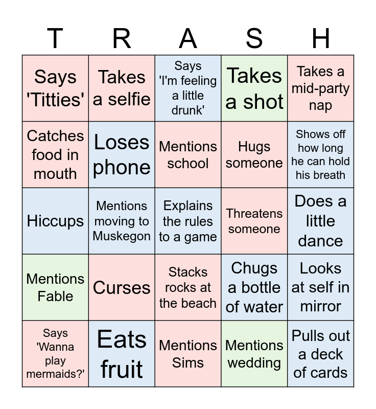 This bingo card has 25 words: Curses, Mentions Sims, Mentions school, Says 'Wanna play mermaids?', Takes a mid-party nap, Says 'Titties', Catches food in mouth, Takes a selfie, Threatens someone, Stacks rocks at the beach, Hugs someone, Hiccups, Chugs a bottle of water, Looks at self in mirror, Loses phone, Pulls out a deck of cards, Does a little dance, Says 'I'm feeling a little drunk', Shows off how long he can hold his breath, Mentions moving to Muskegon, Explains the rules to a game, Eats fruit, Mentions Fable, Takes a shot and Mentions wedding.