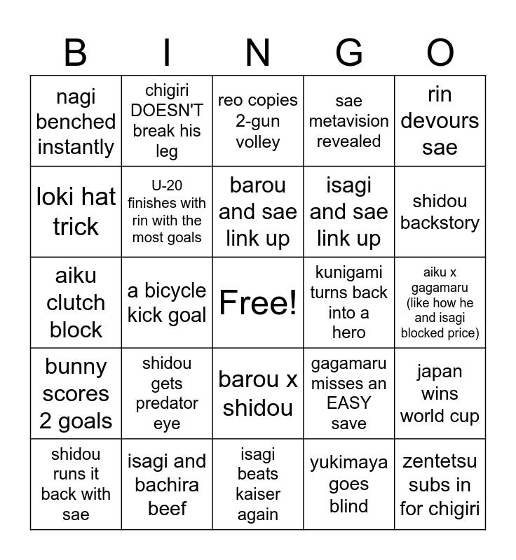 This bingo card has a free space and 24 words: shidou gets predator eye, isagi and bachira beef, barou and sae link up, shidou runs it back with sae, rin devours sae, nagi benched instantly, loki hat trick, chigiri DOESN'T break his leg, kunigami turns back into a hero, barou x shidou, isagi and sae link up, aiku clutch block, gagamaru misses an EASY save, japan wins world cup, U-20 finishes with rin with the most goals, yukimaya goes blind, aiku x gagamaru (like how he and isagi blocked price), reo copies 2-gun volley, shidou backstory, a bicycle kick goal, zentetsu subs in for chigiri, bunny scores 2 goals, sae metavision revealed and isagi beats kaiser again.